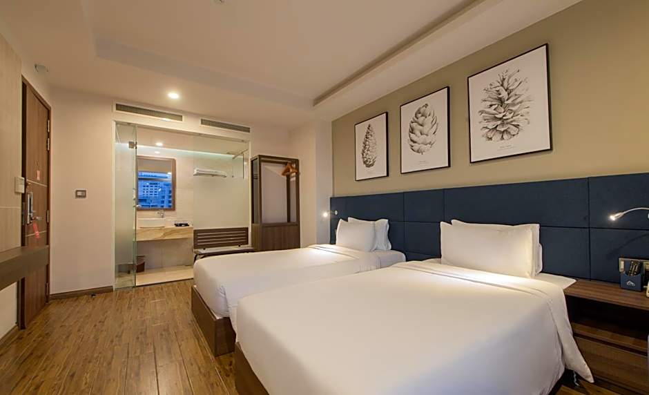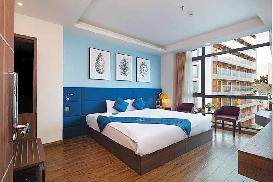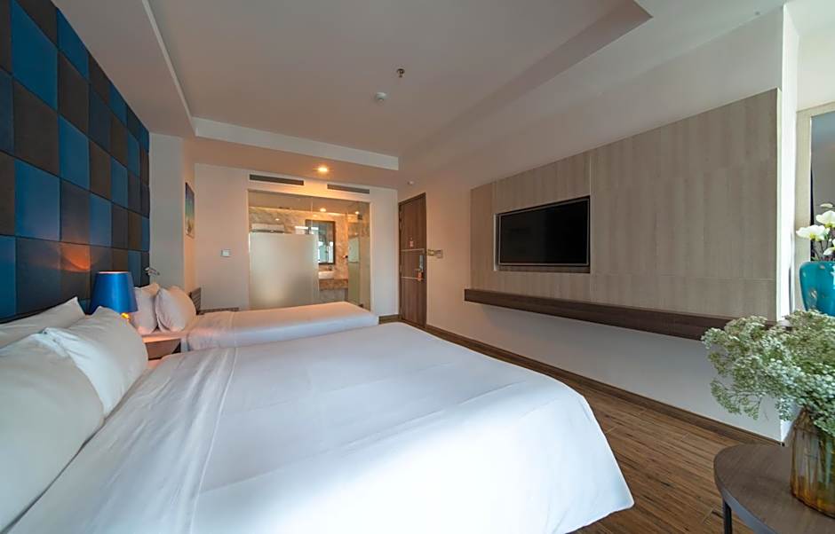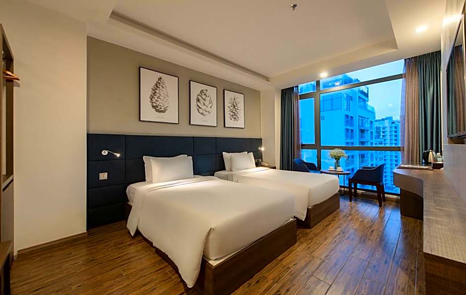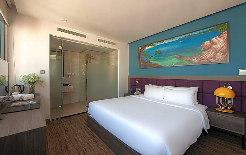 Decorated in warm yellow and beige colors, this modern room is fitted with a private balcony and floor-to-ceiling glazed window overlooking Nha Trang City.
