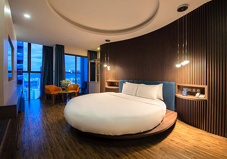 Fitted with a round bed, this suite offers stunning views of the city and sea through glazed windows and private balcony.